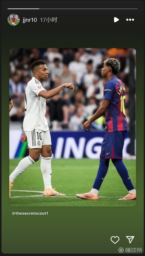 到了2025/26赛季首轮西班牙国家德比那场火药味十足的比赛后,曼联新星JJ-加布里埃尔又在社交媒体上转了个贴文,贴文里说:哇塞,这画面简直太有“戏”了!姆巴佩进球后,对着亚马尔就是一句:“这儿可是我的地盘!”